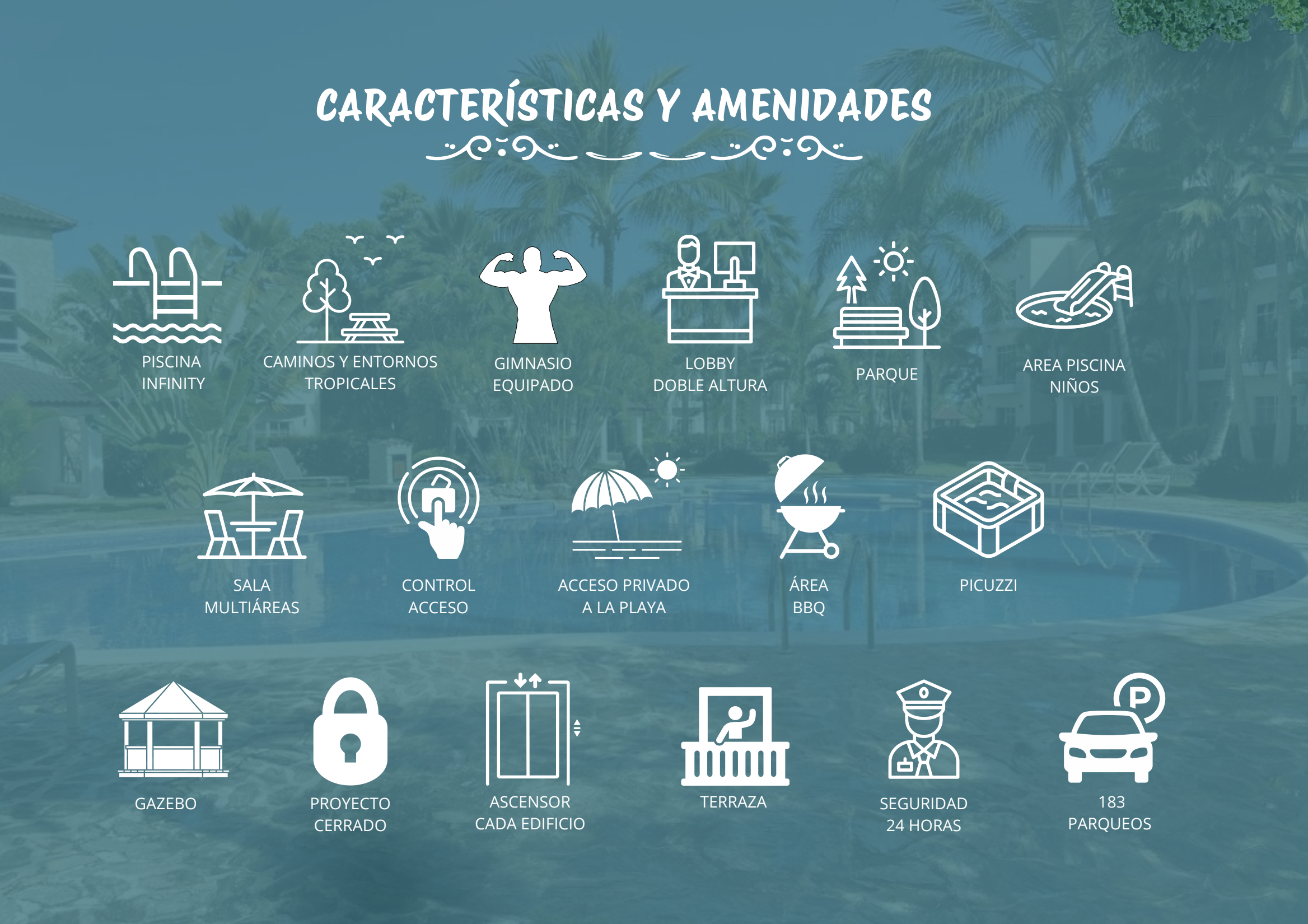 Apartamentos en primer, segundo, o tercer nivel de una superficie construida de 76,61 m2. Cuenta con una habitación principal con baño completo privado y vestidor. Y una habitación secundaria o amplio estudio con closet. Dispone de un baño completo compartido para la segunda habitación y visitas, salón comedor con salida a un balcón con jacuzzi y una cocina con área de lavado. Los primeros niveles en vez de tener jacuzzi en el balcón dispondrán de terraza cubierta amplia, y serán Swim Up (tendrán acceso desde la terraza directo a piscina y jardin de uso privado delimitado con mata a modo de barrera natural)